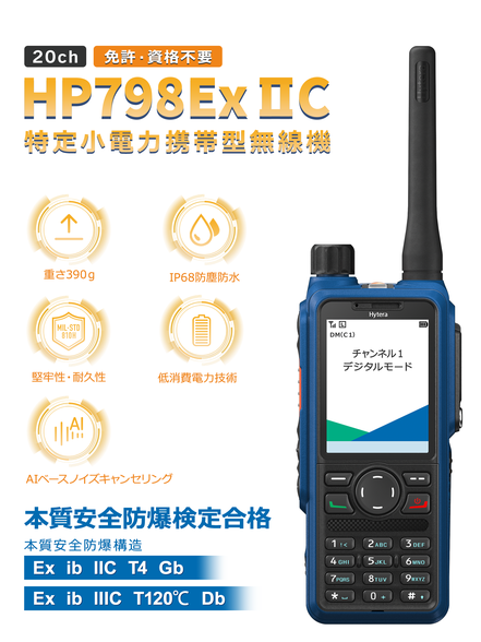 デジタル・アナログチャンネル及び中継チャンネルを実装し、免許・資格不要ですぐに使える本質安全防爆構造のHP798EXLDAR特定小電力防爆無線機